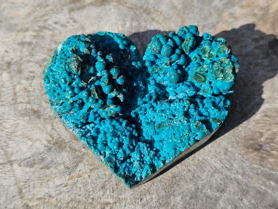 Een bijzonder mooi hart van malachiet en chrysocolla. Aan de bovenzijde is de chrysocolla ruw gelaten waardoor de botryoidal groeivorm van het malachiet heel herkenbaar blijft.
