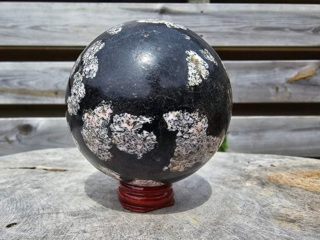 Mooie grote mysterieuze Khyberporphyriet bol met roze veldspaat stippen.